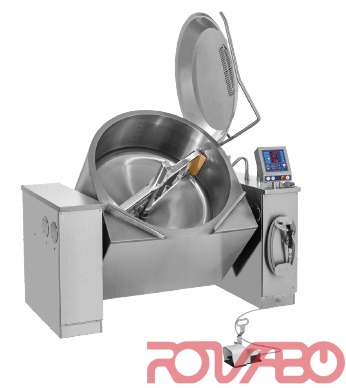 Kettle for large volumes with integrated lightweight hygienic (no joints in the food area) stirrer to safe energy, ergonomic hinged lid in stainless steel with gas spring and inspection hatch. The control can be mounted either to the right or to the left of the kettle. Maxi AutoTemp 32, MaxiMix AutoTemp 56 and MaxiMix AutoChef 86 can be combined. Heating directly with 1 bar steam pressure. Time to boil 10-90°C [min]: 38. Cold water: 1.5-6 bar pressure, 35 l/min (hot water is only used when the kettle is equipped with a spray gun or the possibility to use hot water in the kettle). Ventilation: 17.6 kg/h (if external steam generator: 10-90°, 20 min. - 227 kg/h steam consumption; 7-8 bar, 0.5 l/min compressed air); stirrer: 3 kW, 477 Nm torque, 5-140 rounds per minute. Noise from the machine < 55 dB(A). Distance under the kettle: 65 mm. Control AutoTemp 56, control by the food temperature and heating power dynamic steps (1-9). 15 pre-defined programs with 10 variants, 8 programs of which require the chilling function to be selected, for heating, chilling, stirring and water filling. The programs include timer functions, cook-and-hold, stirring programs and delayed start. Entire processes can also be performed automatically using heating and cooking followed by chilling. 6 dynamic stirring programs for different food, gentle stirring (e.g. when warming or chilling). Easily detachable scrapers on the stirrer. SlowMix - stirring with open lid and speed adjusted between 5-20 rpm. Waterfilling with integrated flowmeter, through a large drip-free spout on the pillar. Litre markings in the bowl. Adjustable TiltBack for easy pouring without dripping. Unheated and insulated top to reduce heat radiation and save energy, also minimizing the risk of burn to the operator and burn of food. A high insulation of the kettles steam chamber - effectiveness up to 97%, saving energy and improving conditions around the kettle. Fast heating: a special steam generator means that the kettle can be used with only a small amount of water around the heating elements. Adjustable controlbox placed at a good working height. Access code to lock the kettle. Error codes making troubleshooting easier. Balanced current reducing connection lost. Accessories: whipping tool for whipping egg white or cream; the cleaning tool MultiClean for automatic cleaning with 4+2 spring-loaded stiff brushes in the kettle bowl following its shape, fitted in the same way as the stirrer; LED light in the kettle bowl when the lid is closed; GN-support under the spout of the tilted kettle; pedal for handfree operation - tilting, SlowMix or manually water filling of the kettle, chosen in the display and activated by the pedal; cooling with tap water: water is fed through the steam jacket, where it chills the content of the kettle and afterwards drained via the floor grate; the sanitary butterfly valve fitted to the front of the kettle, enabling liquid products to be pumped out of the kettle through this valve; the solid spray gun, fitted to a hose supplied from a separate mixing tap; sieve plate and pouring plate fitted to the kettle’s spout - the first one used when water in the kettle is to be drained from potatoes, pasta, etc., the second one used for control of liquids emptying; measuring rod suspended over the lip of the kettle, used for measuring the kettle contents; tool trolley used to store loose accessories for up to 2 kettles such as the stirrer, cleaning tool and sieve plate; for a fixed storage of 2 tools also a wall bracket can be used; rotatable lid - easy access for cleaning; heating by direct steam - connecting the kettle to an inhouse steam supply; 60 cm long tube cleaner with brush to clean the middle tubes of the stirrer; fixtures embedded into the floor with pillars secured directly to the fixture, supplied complete with distance keepers; separate bearing for attaching the kettle’s supporting shaft and replaces a supporting pillar, fitted to anything which can support the weight of the kettle, such as an existing pillar, other equipment or a wall.