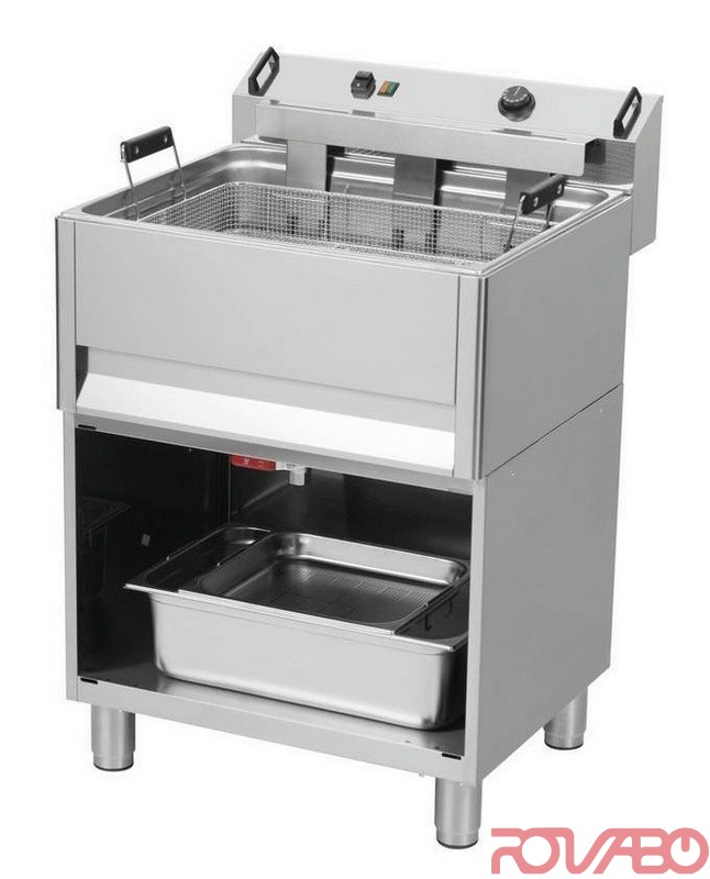 Pressed basins with ergonomic inner shapes and angles for comfortable cleaning and maintainance. Basin is made of AISI 304. Solid support of heating elements ensures a proper cold zone underneath resistances. Safety thermostat at 235°C for security. Solid construction of baskets and long resistances (large surface) - lower electrical load - for long lifetime of components. Work and safety thermostats with ceramic housing. Capacity: 24 kg/h. These comfort line fryers are characterised by better ergonomic makings, mechanical durability, thermal resistance, push button switch with inner isolation, side handles for easier manipulation, stainless steel cover protecting front side of heating elements and capillary, GN bin handles for easier take out of the bin, silicone feeder with antisplash system. Drain tank.