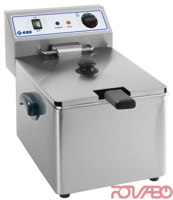 Tabletop equipment with s/s body, baskets and basin. Exterior cr ni steel/ plastic. Rounded tank with an 8 lt fully extractible storage reservoir. Suitable for frying oil or block grease. Isolated lid and basket handle. Temperature is infinitely regulated with a rotating knob up to +190°C. Incl. a safety thermostat, sealed switch with control lamp and extractable heating elements. Serial accessories: 1 basket and 1 lid 190x240x140 mm.