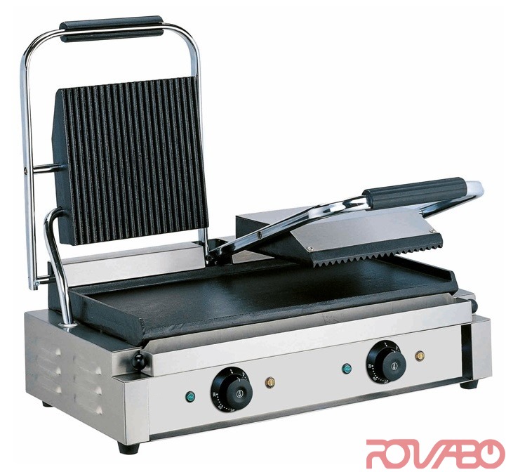 The grill plate top is grooved, the bottom is plain. Robust devices made of chrome nickel steel. Grill plates made of cast iron for ideal heat transfer. Heating indicator light. Operating light ON/OFF. Fat collecting pan. Top grill plates: 215x215 mm each, bottom grill plate: 470x230 mm. 2 separate thermostats. Cleaning brush included.
