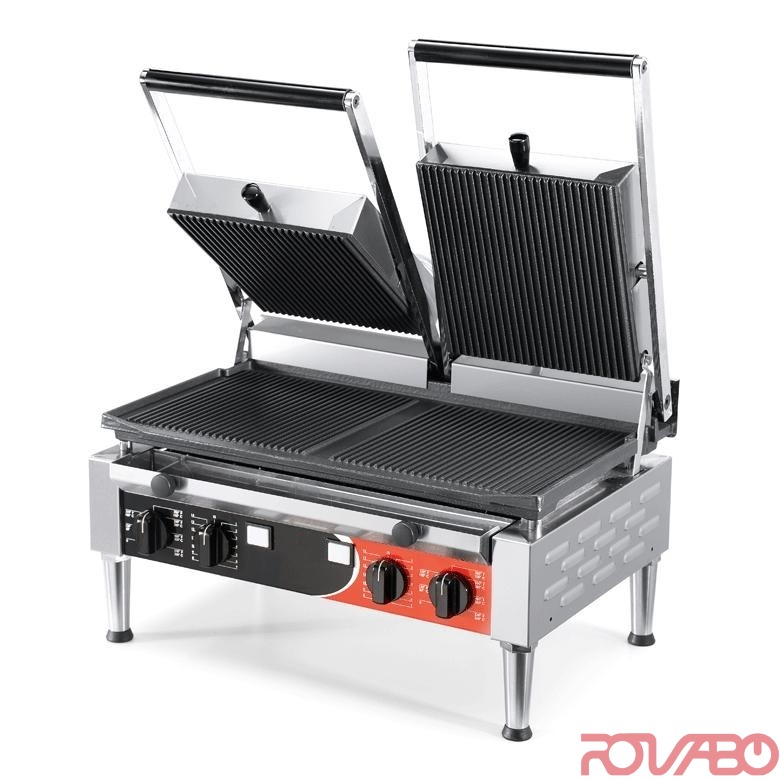 Self balancing upper plate. Shock-proof coated heating elements, adherent to the plates for a perfect thermal conductivity. Adjustable thermostat up to 300 °C. Heavy-duty machine. Thermally protected heating elements. 2 timers. Higher legs to keep your counter under the unit clean. Detachable front drip tray. Removable hinges cover. Comes with side spacers. Useful service: 500x255 mm.