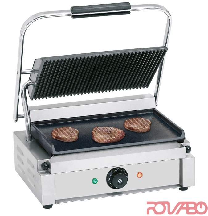 The grill plate top is grooved, the bottom is plain. Robust devices made of chrome nickel steel. Grill plates made of cast iron for ideal heat transfer. Heating indicator light. Operating light ON/OFF. Fat collecting pan. Top grill plate: 335x220 mm, bottom grill plate: 335x230 mm. Cleaning brush included.