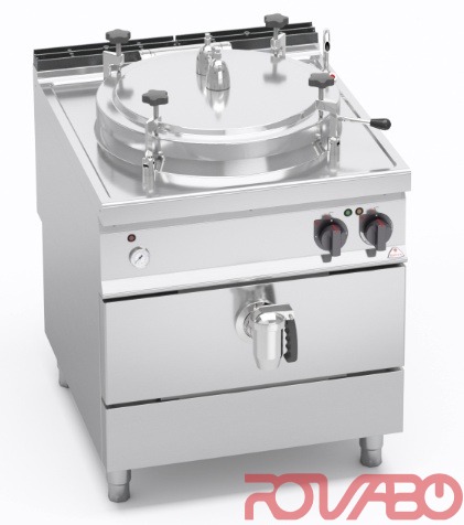 Worktop, front and side panels made of AISI 304 stainless steel. Inside made of stainless steel. AISI 304 stainless steel cooking container with 15/10 thickness, AISI 316 stainless steel bottom with 20/10 thickness. Jacket with bottom and walls of AISI 304 stainless steel, bottom with 20/10 thickness, walls with 15/10 thickness. Indirect type heating with low pressure steam (0.5 bar) generated inside the jacket through armored resistance from Incoloy equipped with a safety thermostat. Hot and cold water taps on the worktop with an articulated spout for filling and washing the container and jacket. 2” draining tap of chromed brass with athermic handle. Four screw fixing blocks that can be adjusted manually with a fixed calibration valve of 0.05 bar. Mechanical gauge with a jacket pressure indicator. Power supply regulated by a 3-position switch. Separate control for temperature regulation. Separate control for temperature regulation. Pilot light and temperature indicator light.