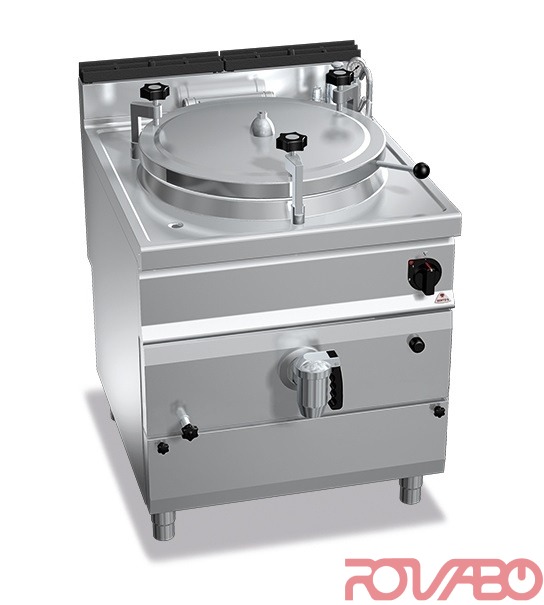 Worktop, front and side panels made of AISI 304 stainless steel. Inside made of stainless steel. AISI 304 stainless steel cooking container with 15/10 thickness, AISI 316 stainless steel bottom with 20/10 thickness. 17.970 kcal/h. Jacket with bottom and walls of AISI 304 stainless steel, bottom with 20/10 thickness, walls with 15/10 thickness. Indirect type heating with low pressure steam (0.5 bar) generated inside the jacket through tubular stainless steel burners with optimized combustion, with thermocouple safety valve and protected pilot flame. Piezoelectric ignition with rubber protection. Hot and cold water taps on the worktop with an articulated spout for filling and washing the container and the jacket. 2” draining tap of chromed brass with athermic handle. Four screw fixing blocks that can be adjusted manually with a fixed calibration valve of 0.05 bar. Temperature regulation by means of a handle tap to adjust the water level.