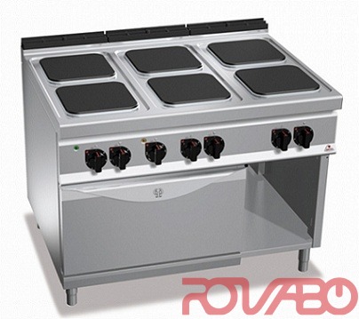 Worktop from AISI 304 stainless steel, front and side panels from AISI 304 stainless steel and Scotch Brite finishing. Pressed top in a unique sealed piece. Cast iron plates with safety thermostat and 6-position selector that activates 6 different concentric power zones. Electric oven with Incoloy stainless steel resistances with oversize diameter. Grill with salamander function in the upper side and thermostat for the correct regulation of temperature from 50° to 270° C. Oven chamber from AISI 430 with 4-level supports and internal, pressed and ribbed door from stainless steel. Pilot light and temperature indicator light.High resistance and double-pressed handles from AISI 304 stainless steel of 20/10 thickness.