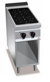 Worktop, front and side panels made of AISI 304 stainless steel. Inside made of stainless steel. Pyroceram top with a thickness of 6 mm. Electrical resistances able to reach high temperatures (500° C) to heat the cooking top with irradiation. Heating circuit in square zones 300 x 300 mm and 4 kW of power. The zones are marked with proper serigraphs that allow the proper positioning of the pans.After switching off each zone, a light signals residual heat up to 60° C to safe-guard the operator.