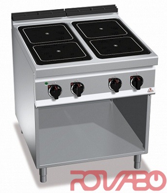 Worktop, front and side panels made of AISI 304 stainless steel. Inside made of stainless steel. Pyroceram top with a thickness of 6 mm. Electrical resistances able to reach high temperatures (500° C) to heat the cooking top with irradiation. Heating circuit in square zones 300 x 300 mm and 4 kW of power. The zones are marked with proper serigraphs that allow the proper positioning of the pans.After switching off each zone, a light signals residual heat up to 60° C to safe-guard the operator.