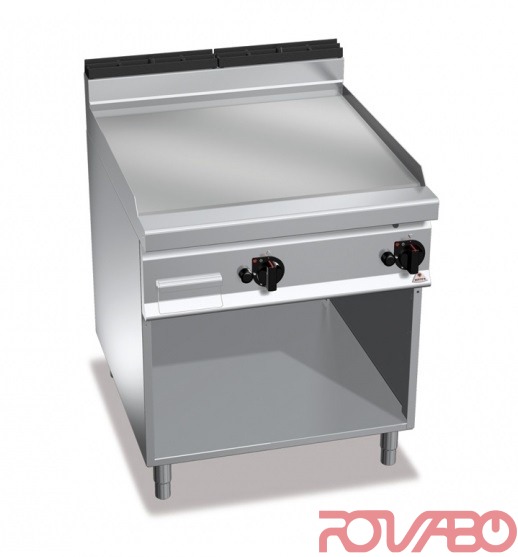 Worktop, front and side panels made of AISI 304 stainless steel. Inside made of stainless steel. 17.197 kcal/h. Tubular burners with self-stabilized flame of a large surface for a greater uniformity of heat distribution. Regulation of the supplied power by a continuous operation tap. Pilot flame and thermocouple safety valve. Piezoelectric ignition with rubber protection. Maximum temperature over 300° C. Smooth plate in thick satin finish steel occupying the entire worktop surface with a flush splashguard. Two zones with separate controls for an independent and perfect regulation of temperature. Slightly inclined cooking surface with a large drain hole and conveyor to a proper sealed container. Large compartment completely in steel.