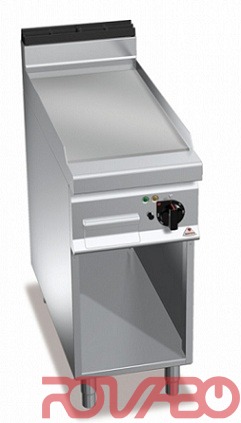 Worktop, front and side panels made of AISI 304 stainless steel. Inside made of stainless steel. Incoloy stainless steel resistances positioned below the cooking plate. Thermostatic control and safety thermostat with manual restart. Temperature regulation from 50 to 270°C. Pilot light and temperature indicator light.Smooth satin finish steel plate of high thickness occupying the entire worktop surface with flush splashguard. Slightly inclined cooking surface with a large drain hole and conveyor to a proper sealed container. Large compartment completely in steel.