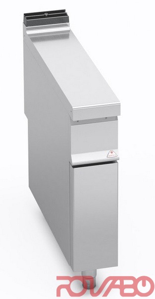 Worktop 200x810 mm and front panels made of AISI 304 stainless steel. Inside made of stainless steel. Single and double models with cabinet, easy to use and clean. Available with a practical removable drawer to keep utensils. Large compartment completely in steel. Optional: door with handle of 20/10 thickness, 2 doors with handle 20/10 thickness.