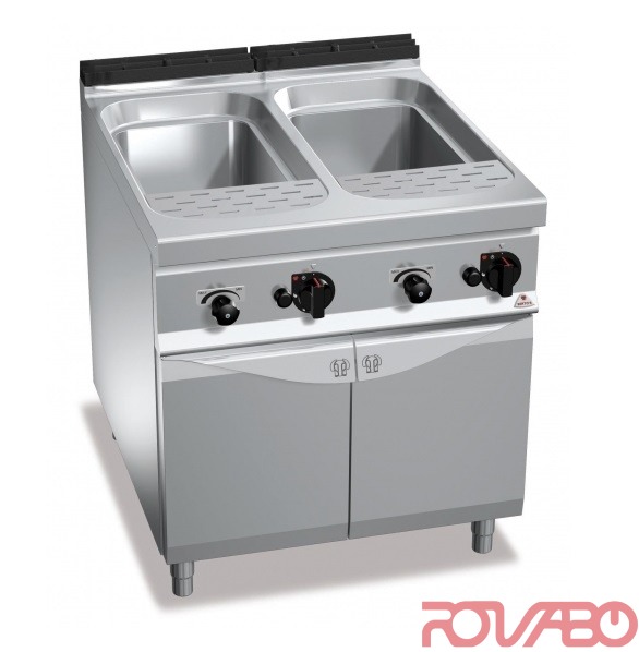Worktop, front and side panels made of AISI 304 stainless steel. Inside made of stainless steel. 20.636 kcal/h. High performances guaranteed by the heating system that externally wraps around the entire tanks surface. Pilot flame and thermocouple safety valve. Piezoelectric ignition with rubber protection. Pressed tanks with large rounded edges completely made in AISI 316 stainless steel. Water circulation guaranteed by a drilled bottom that keeps the baskets 10 cm from the bottom. Large diameter overflow to eliminate the excess starch during cooking. Draining and disassembleable board at the same height of the top. The tap on the board allows one to regulate the water flow through a control on the front panel. Spherical draining tap positioned in the compartment controlled by an athermic handle. Two tanks with separate controls for the independent and optimum regulation of temperature.
