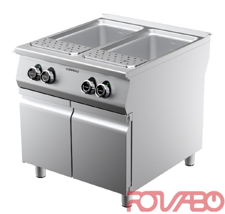 BOWL 309х510x300 mm in AISI 316 stainless steel with a capacity of 40+40L and rounded corners to facilitate cleaning and hygiene. Stainless steel top equipped with a tap for filling and topping up water controlled by an ergonomic knob. Built-in water drain. HEATING via element pack inside the bowl with 9.6kW cooking power adjustable using a switch and an ergonomic knob. Separate controls for each bowl. SAFETY guaranteed by temperature control through manual reset safety limiter. EQUIPPED with false bottom, basket beater and hinged door, optional baskets and lid.