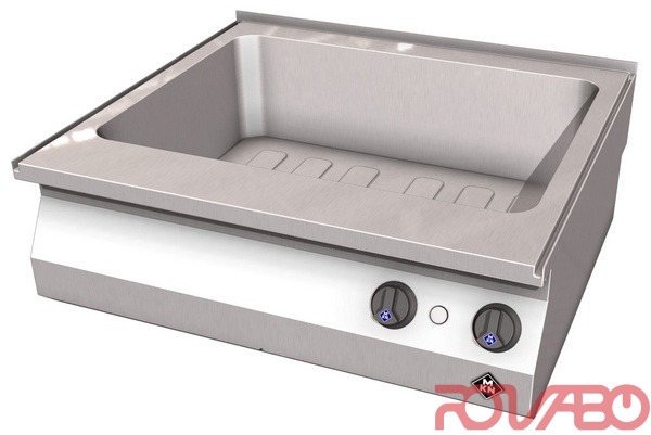 Moulded steel basin with large corner radii – seamlessly and tightly welded into the top plate. Thermostatic temperature regulation – indirect heating ensures easy cleaning. Drain cock and key for safe water drainage at the front. Mains connection with earthed plug. Basin 630x510x215 mm deep for GN 2/1-200 inserts (inserts are not included in delivery). Main switch, thermostat, control lamp, safety temperature thermostat, tubular heating elements, mains connection cable