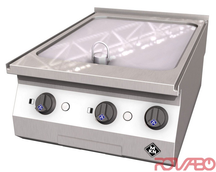 Griddle pans with frying pan made completely of chrome nickel steel 1.4404 (AISI 316), frying surface 420x545 mm of PowerBlock, special sandwich material smooth. Supra contact heating elements for optimal heat distribution and short heating up times. Greater heating capacity ensures even heat distribution and minimal temperature fluctuation when loading with cold food. A long service life is ensured by low heating element temperature and effective heat insulation. Appliance with two separate heating zones with thermostatic temperature regulation. A safety temperature limiter for reliable overheating protection. Griddle plates with fat collecting drawer with splash protection. Mains connection with CEE appliance plug. Griddle plates available in various frying surface finishes: smooth heat resistant steel and the MKN PowerBlock, special sandwich material with smoothly polished surface, half ribbed heat resistant steel or chrome nickel steel. Main switch, thermostat, control lamp, safety temperature thermostat, SUPRA contact heating elements, mains connection cable with 5-channel CEE plug 16 A, IPX4. Optional accessories: 1 splash guard, 1 fat drain plug, 1 griddle plate scraper for smooth and ribbed griddle plates.