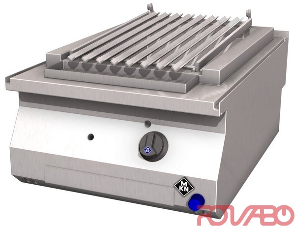 Especially for grilling steaks etc. Special cooking method over lava stones. Grill surface 320x510 mm. DN 15 (½") gas connection required. Atmospheric burner, ignition burner, thermoelectric safeguard, piezoelectric ignition, gas tap. Natural 20; 25 mbar or liquid gas 30; 37; 50 mbar. Accessories: 1 Cast iron grates, lava stones. Optional accessories: 1 Grill grid.