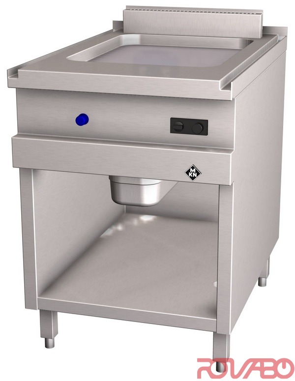 Plate lowered and seamlessly welded into the top plate, with easy to clean corner radii. Thermostatic temperature regulation. Frying plate made of heat resistant special steel. Fat collecting container approx. 4 litres. Natural 20; 25 mbar or liquid gas 30; 37; 50 mbar. Frying surface 420x545 mm. DN 15 (½") gas connection required. Atmospheric burner, ignition burner, thermoelectric safeguard, thermostat, piezoelectric ignition. Optional accessories: splash guard, griddle plate scraper for smooth and ribbed griddle plates.