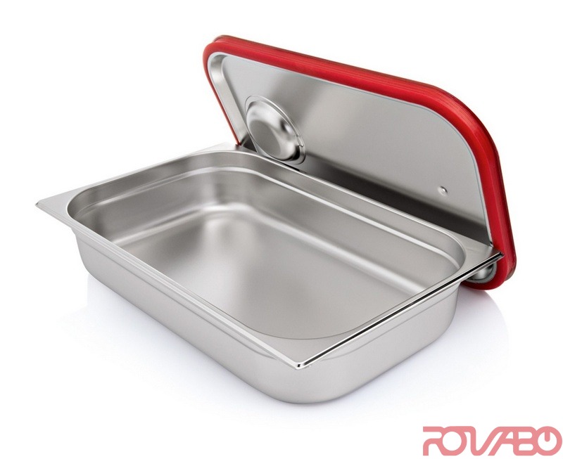 Толщина материала - 0,6 мм. Силиконовый уплотнитель понизу с отверстием во избежание образования вакуума, для гастромкостей GN глубиной от 100 мм и более.
