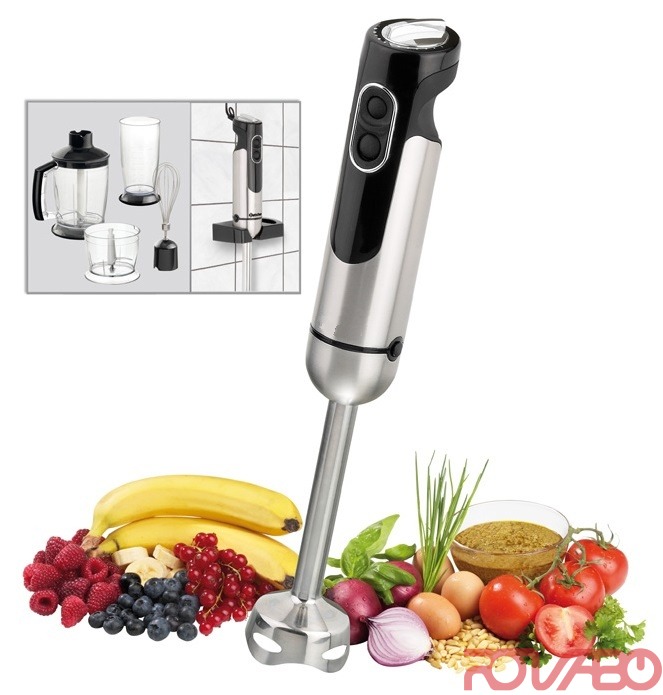 Предназначен для смешивания, измельчения, взбивания различных продуктов и приготовления пюре на предприятиях общественного питания и торговли. Модель и комплектующие части легко мыть. Корпус изготовлен из нержавеющей стали. Количество скоростей: 5. Скорость: 17000 об/мин. Длина насадки: 207 мм. Высота: 410 мм. В комплект поставки входят: 1 венчик для взбивания, 1 контейнер объемом 800 мл, 2 специальных контейнера с серповидными ножами объемами 500 мл и 1250 мл, 1 универсальная крышка, 2 подставки, 1 крепление на стену.