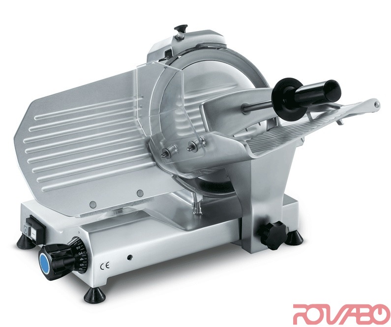 Литьевой сплав анодированного алюминия. Большое расстояние между двигателем и лезвием для более удобной очистки. Проветриваемый двигатель. Лезвие высокотемпературной ковки. Скольжение каретки по самосмазывающимся втулкам и притирочным стержням. Гаечный комплект и разделитель ломтиков из нержавеющей стали. Крепкий держатель рабочего стола. Встроенное литьевое затачивающие устройство с двойным наждаком. Компактные размеры, но большая способность резки. Имеются тефлоновые и зубчатые лезвия. Hаклон ножа в 25°. Диаметр ножа: 275 мм. Толщина нарезки: 13 ммю Ход каретки: 245 мм. Лоток: 230х240 мм.