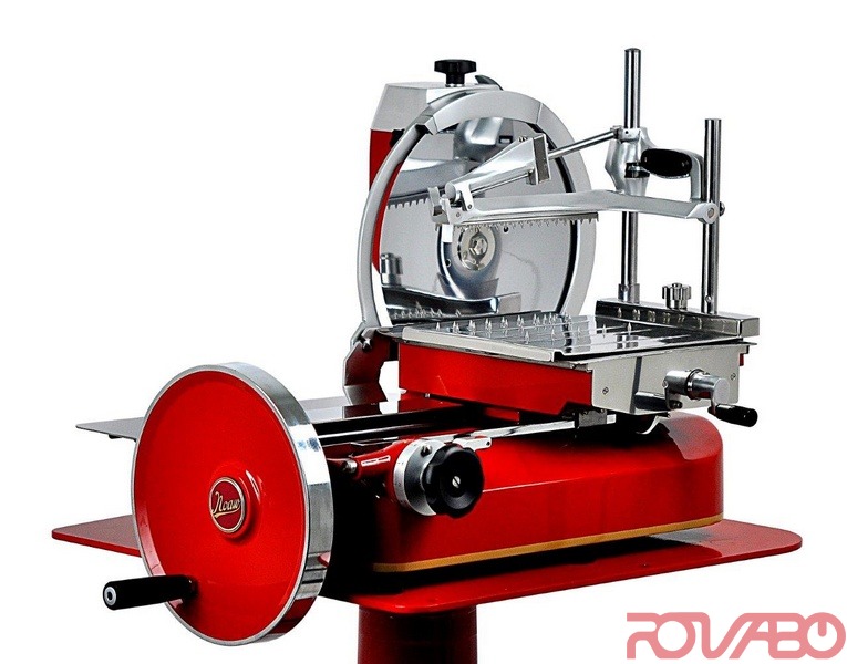 Диаметр лезвия - 330 мм, ход каретки - 290 мм, регулятор толщины - 0-1,5 мм, режущая способность - ø235 мм. Полностью из алюминия и нержавеющей стали. Для мясной нарезки разного типа и, в частности, прошутто. Стандартный цвет - красный. По запросу возможны другие цвета. По запросу может поставляться на специальной подставке такого же цвета, как аппарат - 2 модификации: железо и чугун.