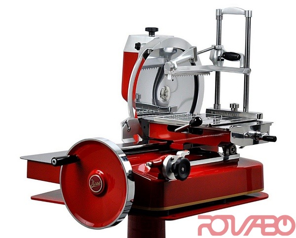 Диаметр лезвия - 370 мм, ход каретки - 320 мм, регулятор толщины - 0-2 мм, режущая способность - ø245 мм. Полностью из алюминия и нержавеющей стали. Для мясной нарезки разного типа и, в частности, прошутто. Стандартный цвет - красный. По запросу возможны другие цвета. По запросу может поставляться на специальной подставке такого же цвета, как аппарат - 2 модификации: железо и чугун.