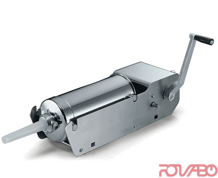 Корпус и прочный цилиндр с двухсторонней сваркой в основании из нержавеющей стали AISI 304, поршень из пищевого нейлона, коробка передач из оцинкованной стали, зубчатая передача из шлифованной закаленной стали. Поршень с клапаном для выпуска воздуха. Передача через 4 герметичных подшипника. 2 скорости. Длина цилиндра: 370 мм. Диаметр цилиндра: 165 мм. Шаг поршня: 420 мм. В комплекте: 3 загрузочные трубки из пищевого нейлона ø10, 18, 25 мм. Фиксирующий зажим. По запросу: решётка из нержавеющей стали.