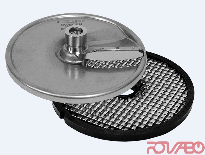Комплект включает в себя диск для нарезки ломтиками и решётку для нарезки кубиками, комбинируемые для нарезки кубиками твёрдых и мягких овощей, фруктов и т.п. Применим в следующих аппаратах: CC-34, RG-50 (комплекты для нарезки кубиками от RG-100 применимы к CC-34 и RG-50), а также RG-100.