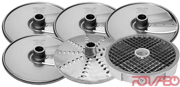 Слайсер (диск для нарезки ломтиком) 1,5 мм, слайсер 4 мм, слайсер 6 мм, слайсер 10 мм, тёрка/измельчитель 4,5 мм, решётка для нарезки кубиком 10x10 мм. Все режущие инструменты изготовлены из нержавеющей стали - можно мыть в машине.