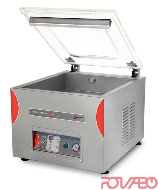 Настольная модель. Корпус и камера 530x530xh (115+95) мм из нержавеющей стали. Поставляется вместе со вставными пластинами. Запаечная планка 1x520 мм. Вакуумный насос: 20 м3/ч (0,75 кВт). Высокопрочная выпуклая крышка с системой блокировки из прозрачного метакрилата. Легкосъёмная запаечная планка на поршнях для упрощения очистки, отсутствие незакреплённых электрических кабелей. Низковольный механизм управления. Аналоговый вакуумметр. 10 рабочих программ. Предусмотрена программа маринования. Дополнительные комплектующие: насос увеличенной производительности 25 м3/ч (вместо стандартного); вакуумная откачка во внешней ёмкости; две параллельные герметизирующие проволоки; дополнительная запаечная планка (1-3 шт.); газовый инъектор для упаковки в защитной атмосфере; вставная пластина под наклоном (для жидкостей).