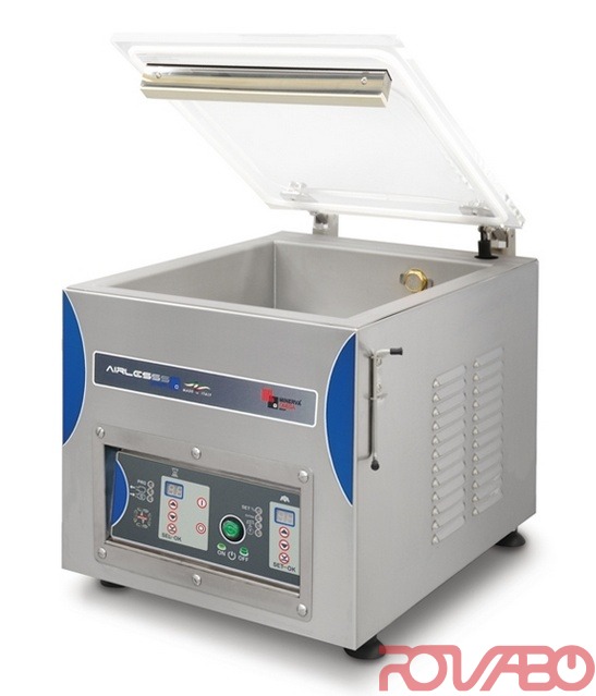 Камера и корпус изготовлены из нержавеющей стали. Двойной шов – две параллельные запаечные линии/ проволки. Вакуумный насос BUSCH на 16 м3/ч (0,55 кВт). 10 рабочих программ. Вакуумная камера размерами 435x455xh (115+60) мм. Система электронного контроля уровня вакуума позволяет настраивать уровень необходимого вакуума в пакете в процентном отношении. Система автоматической калибровки датчика давления в соответствии с условиями среды установки аппарата (атмосферное давление, статус работы насоса, степень загрязнения масла и пр.). Система с функцией создания дополнительного вакуума позволяет достичь необходимый уровень вакуума упаковываемаго продукта (при наличии жидкости в продукте или вокруг него). Насосы BUSCH: все модели линии RECORD оснащены насосами Busch. Под заказ: принтер (встроенный в аппарат – заказывается при заказе аппарата); усиленный насос Busch на 20 м3/ч (0,75 кВт) вместо стандартног насоса; добавочная запаечная планка (1-3 планки); внешний вакуумный контейнер; газовый инъектор для упаковки в защитной среде; вставка для регулировки загрузки под углом (для жидкостей).