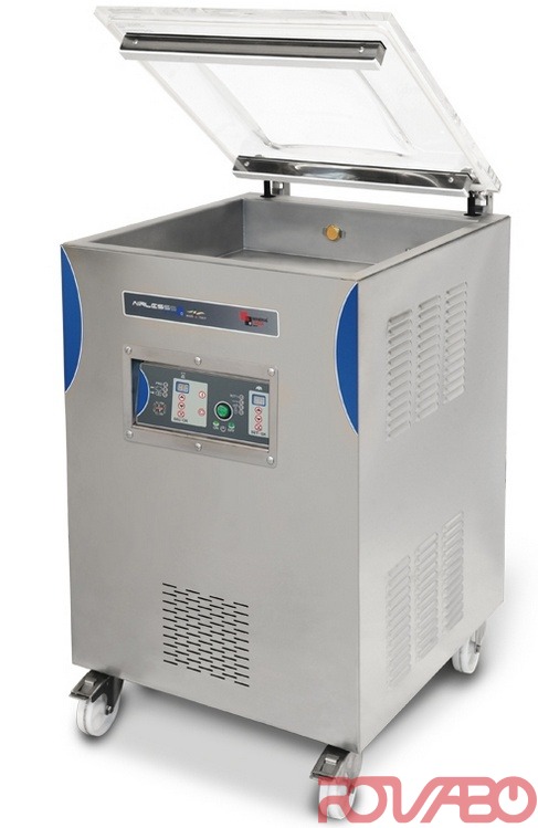 Камера и корпус изготовлены из нержавеющей стали. Двойной шов – две параллельные запаечные линии/ проволки. Вакуумный насос BUSCH на 25 м3/ч (0,9 кВт). 10 рабочих программ. Вакуумная камера размерами 530x530xh(115+95) мм. Система электронного контроля уровня вакуума позволяет настраивать уровень необходимого вакуума в пакете в процентном отношении. Система автоматической калибровки датчика давления в соответствии с условиями среды установки аппарата (атмосферное давление, статус работы насоса, степень загрязнения масла и пр.). Система с функцией создания дополнительного вакуума позволяет достичь необходимый уровень вакуума упаковываемаго продукта (при наличии жидкости в продукте или вокруг него). Насосы BUSCH: все модели линии RECORD оснащены насосами Busch. Под заказ: принтер (встроенный в аппарат – заказывается при заказе аппарата); усиленный насос Busch на 40 м3/ч (1,1 кВт) вместо стандартного насоса; добавочная запаечная планка (1-3 планки); противоположная запаечная планка на крышке (1-2 планки) - (ТОЛЬКО для передних планок, НЕ для боковых); внешний вакуумный контейнер; газовый инъектор для упаковки в защитной среде; вставка для регулировки загрузки под углом (для жидкостей).