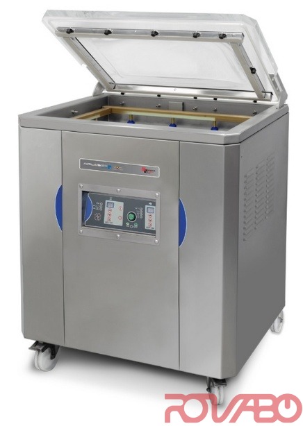 Камера и корпус изготовлены из нержавеющей стали. Двойной шов – две параллельные запаечные линии/ проволки. Вакуумный насос BUSCH на 63 м3/ч (1,5 кВт). 10 рабочих программ. Вакуумная камера размерами 760x615xh(120+100) мм. Система электронного контроля уровня вакуума позволяет настраивать уровень необходимого вакуума в пакете в процентном отношении. Система автоматической калибровки датчика давления в соответствии с условиями среды установки аппарата (атмосферное давление, статус работы насоса, степень загрязнения масла и пр.). Система с функцией создания дополнительного вакуума позволяет достичь необходимый уровень вакуума упаковываемаго продукта (при наличии жидкости в продукте или вокруг него). Насосы BUSCH: все модели линии RECORD оснащены насосами Busch. Под заказ: принтер (встроенный в аппарат – заказывается при заказе аппарата); усиленный насос Busch на 100 м3/ч (2,2 кВт) вместо стандартного насоса; добавочная запаечная планка (1-3 планки); противоположная запаечная планка на крышке (1-2 планки) - (ТОЛЬКО для передних планок, НЕ для боковых); внешний вакуумный контейнер; газовый инъектор для упаковки в защитной среде; вставка для регулировки загрузки под углом (для жидкостей).