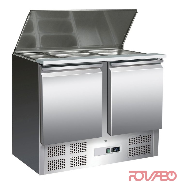 Салат-бар из хромоникелевой стали с 3-сторонней изоляцией испарителя, электронным управлением с цифровым температурным табло, регулировка температуры посредством термостата с электронным управлением. Разделочная доска из полиэтилена, основание выполнено с конусообразным углублением, сливом конденсата по центру. Для оптимальной циркуляции воздуха в основании за каждой дверью предусмотрена дополнительная решётка. Переключатель "вкл"/"выкл" с подсветкой. Жировой фильтр расположен за запираемой панелью аппарата (простое извлечение и очистка). Расчитано на 3 GN 1/1, ёмкости глубиной 150 мм. Максимум на 5 решёток, включая 5 пар неопрокидываемых направляющих (принадлежности) на дверцу отсека. Изоляция стенок - 35 мм. Дверной упор слева/ справа. Дверные уплотнители просты в обслуживании, инструменты не требуются. Охлаждение с рециркуляцией. Автоматическая система оттаивания. Испарение конденсата. Хладагент R600a (изобутан)/ потенциал глобального потепления GWP3. Ёмкости GN в комплект поставки не входят. Принадлежности: 5 делителей, 1 белая рильсановая решётка GN 1/1 на дверцу и 2 пары неопрокидываемых направляющих, разделочная доска из полиэтилена.