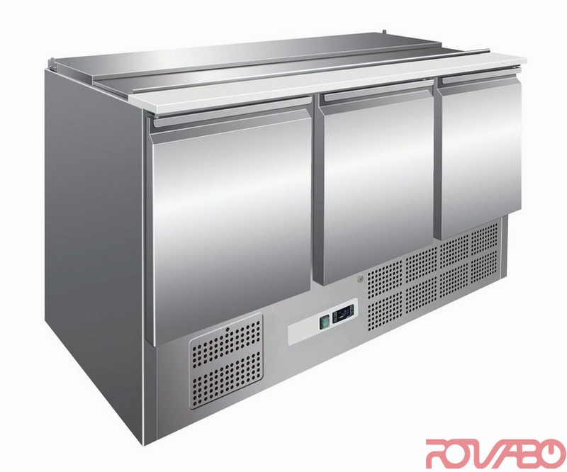 Салат-бар из хромоникелевой стали с 3-сторонней изоляцией испарителя, электронным управлением с цифровым температурным табло, регулировка температуры посредством термостата с электронным управлением. Разделочная доска из полиэтилена, основание выполнено с конусообразным углублением, сливом конденсата по центру. Для оптимальной циркуляции воздуха в основании за каждой дверью предусмотрена дополнительная решётка. Переключатель "вкл"/"выкл" с подсветкой. Жировой фильтр расположен за запираемой панелью аппарата (простое извлечение и очистка). Расчитано на 4 GN 1/1, ёмкости глубиной 150 мм. Максимум на 5 решёток, включая 5 пар неопрокидываемых направляющих (принадлежности) на дверцу отсека. Изоляция стенок - 35 мм. Дверной упор слева/ справа/ справа. Дверные уплотнители просты в обслуживании, инструменты не требуются. Охлаждение с рециркуляцией. Автоматическая система оттаивания. Испарение конденсата. Хладагент R600a (изобутан)/ потенциал глобального потепления GWP3. Ёмкости GN в комплект поставки не входят. Принадлежности: 5 делителей, 1 белая рильсановая решётка GN 1/1 на дверцу и 2 пары неопрокидываемых направляющих, разделочная доска из полиэтилена.
