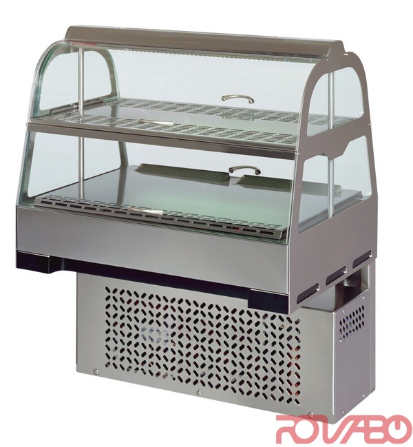 Благодаря современному дизайну витрина представляет собой уникальное проморешение для десертов, пирожных и т.п. Подходит для небольших ресторанов, баров, кафе. Технические характеристики: корпус из нержавеющей стали, стеклянная верхняя и боковые стенки, шарнирные дверцы из плексигласа/ оргстекла, 2 экспозиционные секции с индивидуальным освещением 2х0,015 кВт, охлаждение посредством принудительной циркуляции воздуха с автоматической разморозкой и электронным блоком управления. Полки размерами 560x240, 590x310 мм. По запросу: верхняя промопанель из плексигласа/ орстекла (стандартная надпись "Десерт" (Dessert)/ возможна надпись индивидуального исполнения); возможна модификация для самообслуживания (с 4 шарнирными передними и задними дверцами).