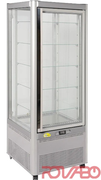 5 полок размерами 503x460 мм. Влажность: 40%. Ручная разморозка, испарение. Хладагент R290. Замок по запросу. Освещение светодиодное. Статическое охлаждение. Стандартные цвета: серебро, лакированная бронза, экстра: ral.