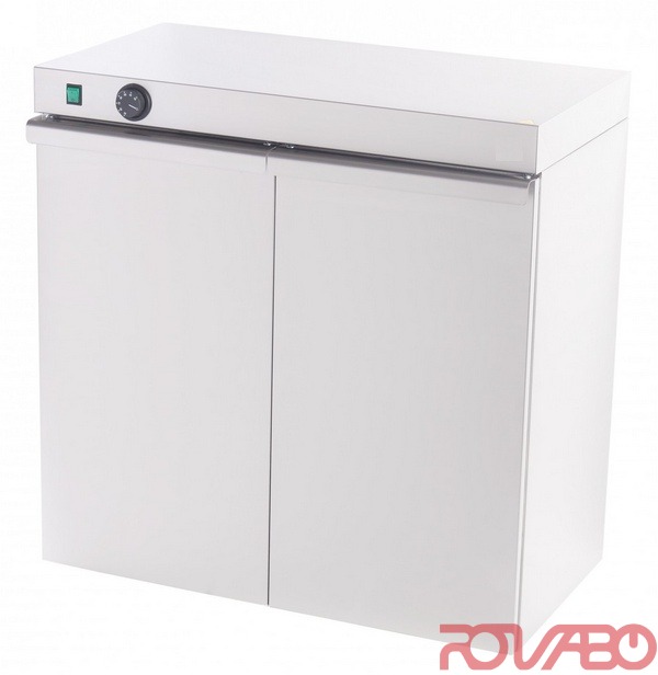 Изготовлен из нержавеющей стали. Статическое тепло (без вентилятора); ручная регулировка в диапазоне 30-90°C. Предназначен для поддержания тепла тарелок, возможно кружек и пр. при температуре подачи. Двустенная конструкция для надлежащей воздушной изоляции во избежание теплопотерь. По выбору - открытие дверцы вправо или влево (в моделях на 1 дверцу). Вместимость - 120 тарелок ø350 мм.