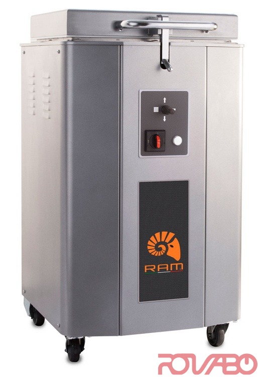 Machine suitable to divide dough for bakeries, pastry workshop and pizzerias. Steel stove painted structure. Reduced dimensions for an easy positioning inside the workshop. Stainless steel AISI 304 bowl and knives. Complete hydraulic working with big tank and double sealing between tank and hydraulic unit. High quality food material stamps not subject to expansion. Stainless steel anti-corrosion protection above to the stamping plate. Stainless steel collecting crumbs tray easy to reach thanks to lateral covers assembled on hinges. Knives cleaning push-button. On castors made of soft rubber with brake for greater stability and noiselessness. Working cycle: independent pressing and cutting by joystick, manual lid opening.