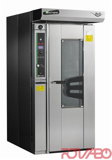 Модельный ряд BELL: цифровая панель управления с системой прокрутки/ скроллинга, ЖК-дисплеем и встроенным светодиодным дисплеем, 30 сохраняемых программ, система розжига с еженедельной настройкой (2 ежедн.), система вращения верхнего крюка (вешала), 2-скоростной вентилятор для выпекания, дверца с двойным остеклением, открываемая более чем на 180°, наружные панели из нержавеющей стали, термоизоляция панелями из высокоплотной минеральной ваты, традиционный каскадный парогенератор, ручной паровой увлажнитель, вытяжка пара, экономайзер со свободным выходом на выпечку 1/3 – 2/3 – 3/3 в моделях -FS (запатентованная система: BELL "FREESTYLE" - единственная "3-секционная электрическая ротационная печь", позволяющая снизить энергопотребление на 33-66%, когда не требуется выпекание на всю тележку - 3 режима выпекания: 5/6, 10/12 или 15/18 противня с потребляемой мощностью 1/3, 2/3 или 3/3), подвод электричества в моделях -Е, -FS, продуктов горения (газ, СУГ или газойль) в моделях -C, поставка 2 модулями (= простая сборка 2/3 ч макс.). Среднее потребление в час: 23 кВт. E = электрическая модель.