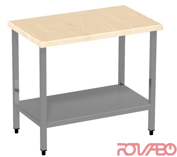 Стол изготовлен из нержавеющей стали AISI 304. Столешница изготовлена из ясеня. Толщина столешницы 35 мм. Ножки стола изготавливаются из трубы 40х40 мм. Высота стола регулируется вкручивающимися опорами ножек.