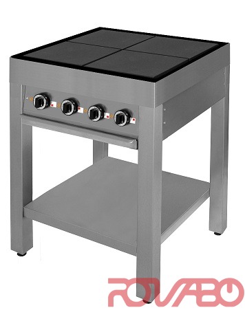 Корпус изготовлен из листовой шлифованной нержавеющей стали, ножки - из трубы нержавеющей стали 50х50 мм. Съёмный жиросборник под конфорками. Чугунные конфорки „EGO“ 300х300 мм можно наклонять для упрощения очистки, каждая на 3 кВт, 380В, 50Гц. 7-позиционный переключатель зон нагрева «EGO» для интенсивного использования. Четырёхконфорочная плита на 12 кВт, 380В, 50Гц. Прочные выкручивающиеся опоры ножек, высота регулировки - 30 мм(+15/-15).