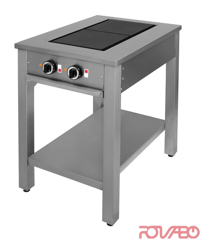 Корпус промышленной электрической плиты изготовлен из листовой шлифованной нержавеющей стали, покрыт защитной ПВХ-плёнкой. Ножки плиты изготовлены из трубы нержавеющей стали 50х50 мм. Съемный жиросборник под конфорками. Откидные чугунные конфорки „EGO“ 300х300 мм для упрощения очистки. Мощность каждой – 3 кВт, 380В, 50Гц. 7-позиционный переключатель зон нагрева «EGO», для интенсивного использования. Прочные опоры ножек регулируются по высоте на 30 мм (+/-15). Стандартная длина - L= 600 мм, ширина W= 800 мм, высота H= 850-880 мм.