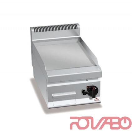 Рабочая поверхность из нержавеющей стали AISI304. 3 439 ккал/ч. Трубчатые горелки с самостабилизирующимся пламенем и большой удельной поверхностью для обеспечения более равномерного распределения тепла. Кнопка пьезоэлектрического поджига с защитой из силикона. Регулировка мощности ручкой с термостатом. Незначительно наклонённые края варочной поверхности с крупным отверстием для слива со сливной линией и жиросборником. Запальная горелка и предохранительный клапан, оснащённый термопарой. Предельная регулируемая температура в диапазоне 280°С. Поверхность гладкая, с твёрдым хромовым покрытием и брызгозащитным бортиком для лучшего освещения и упрощения очистки; низкий уровень излучения тепла для обеспечения комфортной работы оператора. Подходит для приготовления в щадящем режиме.