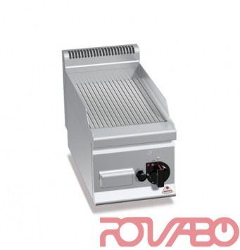 Рабочая поверхность изготовлена из нержавеющей стали AISI 304. Трубчатые горелки с самостабилизирующимся пламенем и большой удельной поверхностью для обеспечения более равномерного распределения тепла. Регулировка мощности ручкой непрерывного действия. Запальная горелка и предохранительный клапан, оснащённый термопарой. Пьезоэлектрический поджиг с защитой из силикона. Температура выше 300°С. Поверхность РИФЛЁНАЯ из матовой стали, с брызгозащитным бортиком. Незначительно наклонённые края с крупным отверстием для слива со сливной линией и жиросборником.