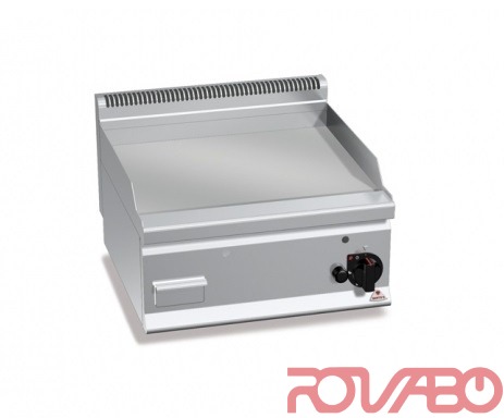 Рабочая поверхность из нержавеющей стали AISI304. 6 878 ккал/ч. Трубчатые горелки с самостабилизирующимся пламенем и большой удельной поверхностью для обеспечения более равномерного распределения тепла. Кнопка пьезоэлектрического поджига с защитой из силикона. Регулировка мощности ручкой с термостатом. Незначительно наклонённые края варочной поверхности с крупным отверстием для слива со сливной линией и жиросборником. Запальная горелка и предохранительный клапан, оснащённый термопарой. Предельная регулируемая температура в диапазоне 280°С. Поверхность гладкая, с твёрдым хромовым покрытием и брызгозащитным бортиком для лучшего освещения и упрощения очистки; низкий уровень излучения тепла для обеспечения комфортной работы оператора. Подходит для приготовления в щадящем режиме.