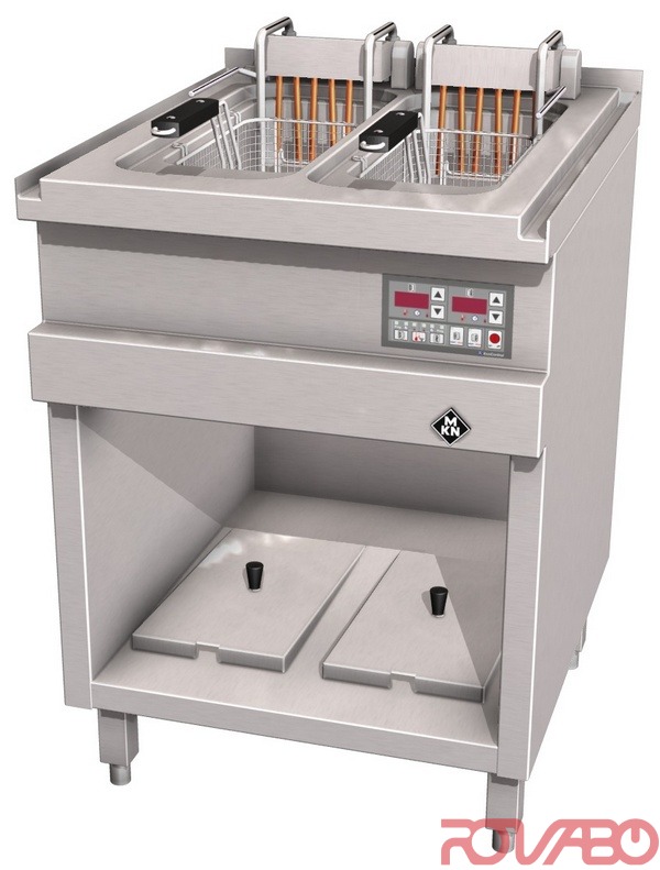 С системой электронного терморегулирования EcoControl и мембранной кнопочной панелью. Сварная бесшовная жарочная ванна, каждая размерами по 180x400x235 мм, штампованная сталь, с крупным сливным жёлобом. Тэны из хромоникелевой стали. Простота очистки обеспечивается полным извлечением нагревательных элементов из ванны фритюрницы, с крепёжным кронштейном и автоматическим выключением, для упрощения очистки. Трубчатые нагревательные элементы малой поверхностной нагрузки и длительного срока эксплуатации, подходят для использования в масляной среде. Глубокая охлаждаемая зона ванны. Термостатическое или электронное регулирование температуры. Предохранительный термостат для надёжности защиты от перегрева. Главный выключатель, термостат, предохранительный термостат, контрольный индикатор, тэны, пускатель, концевой выключатель, подключение к силовой сети, класс защиты IPX 5. С подъёмником корзин. В стандартной комплектации предусмотрен интерфейс для подключения к системе оптимизации электропитания c беспотенциальным контактом. Принадлежности: 2 крышки, 2 отстойника для очистки масла, 2 корзины "L". Принадлежности по запросу: маслосборник на 30 л, система фильтрации масла, корзина в комплекте с 40 специальными флисовыми фильтр-пакетами, вставные ножки к аппарату h200 мм, регулируемые по высоте на +/– 15 мм (4 шт.).