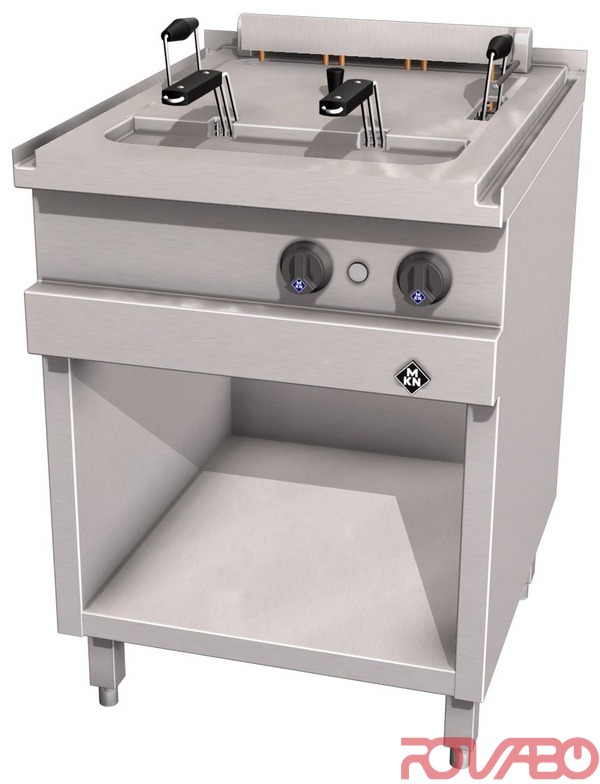 Сварная бесшовная жарочная ванна размерами 400x400x235 мм, штампованная сталь, с крупным сливным жёлобом. Тэны из хромоникелевой стали. Простота очистки обеспечивается полным извлечением нагревательных элементов из ванны фритюрницы, с крепёжным кронштейном и автоматическим выключением, для упрощения очистки. Трубчатые нагревательные элементы малой поверхностной нагрузки и длительного срока эксплуатации, подходят для использования в масляной среде. Глубокая охлаждаемая зона ванны. Термостатическое или электронное регулирование температуры. Предохранительный термостат для надёжности защиты от перегрева. Главный выключатель, термостат, предохранительный термостат, контрольный индикатор, тэны, пускатель, концевой выключатель, подключение к силовой сети, класс защиты IPX 5. Возможны модификации с повышенной тепловой мощностью, с подъёмником корзин и таймером. Безопасный слив масла из нижней части по подвижному клапану. Возможно подключение к системе оптимизации электропитания c беспотенциальным контактом. По запросу: функция топления масла. Комплектующие: 1 крышка, 1 жиросборник, 1 корзина 350х380 мм, 2 корзины 160х313 мм.