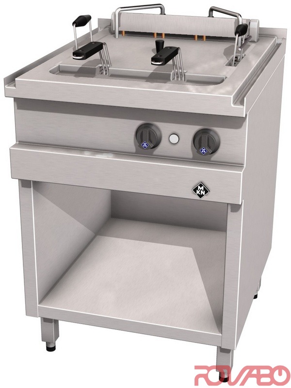 Сварная бесшовная жарочная ванна размерами 400x400x235 мм, штампованная сталь, с крупным сливным жёлобом. Тэны из хромоникелевой стали. Простота очистки обеспечивается полным извлечением нагревательных элементов из ванны фритюрницы, с крепёжным кронштейном и автоматическим выключением, для упрощения очистки. Трубчатые нагревательные элементы малой поверхностной нагрузки и длительного срока эксплуатации, подходят для использования в масляной среде. Глубокая охлаждаемая зона ванны. Термостатическое или электронное регулирование температуры. Предохранительный термостат для надёжности защиты от перегрева. Главный выключатель, термостат, предохранительный термостат, контрольный индикатор, тэны, пускатель, концевой выключатель, подключение к силовой сети, класс защиты IPX 5. Модификация с подъёмником корзин и таймером. Безопасный слив масла из нижней части по подвижному клапану. Возможно подключение к системе оптимизации электропитания c беспотенциальным контактом. По запросу: функция топления масла. Комплектующие: 1 крышка, 1 жиросборник, 1 корзина 350х380 мм, 2 корзины 160х313 мм. Система фильтрации масла отсутствует.