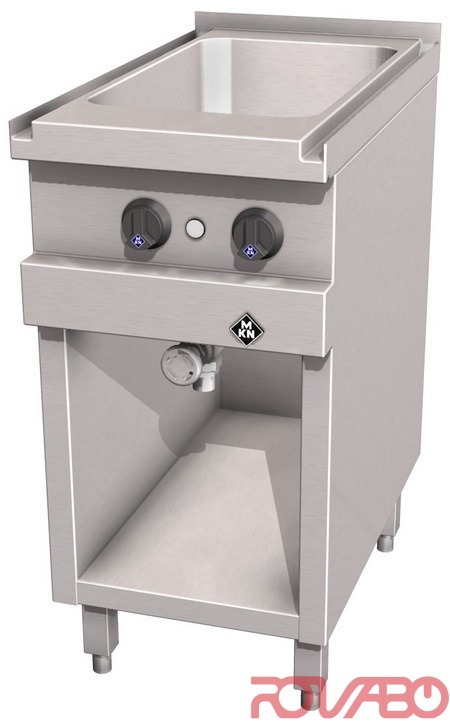 Сварная бесшовная верхняя поверхность с ванной из штампованной стали с крупными закруглёнными углами. Ванна размерами 305x510 мм на гастроёмкость 1x1/1 не глубже 200 мм (в комплект не входят). Главный выключатель, термостат, контрольный индикатор, тэны, подключение к сети, класс защиты IPX 5. Термостатический регулятор температуры. Благодаря косвенному нагреву мармит очень легко чистится. Предусмотрено подключение к системе оптимизации электропитания с беспотенциальным контактом.