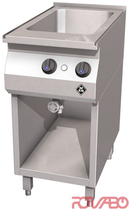 Сварная бесшовная верхняя поверхность с ванной из штампованной стали с крупными закруглёнными углами. Ванна размерами 305x510 мм глубиной 215 мм с перфорацией снизу. Главный выключатель, термостат, контрольный индикатор, тэны, предохранительный ограничитель температуры, подключение к сети, класс защиты IPX 4. Термостатический регулятор: благодаря косвенному нагреву мармит очень легко чистится. По запросу возможно оснащение интерфейсом для подключения к системе оптимизации электропитания с беспотенциальным контактом. Принадлежности по запросу: 1 кран для подвода воды с поворотным изливом R½", 1 вставная полка, вставные ножки к аппарату h200 мм, регулируемые по высоте на +/– 15 мм (4 шт.).
